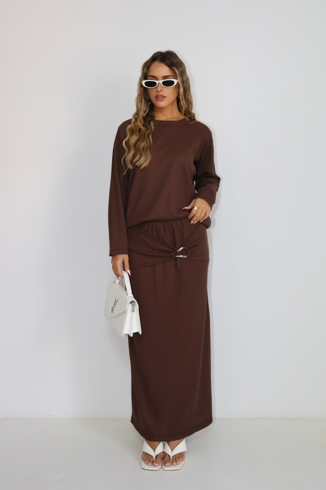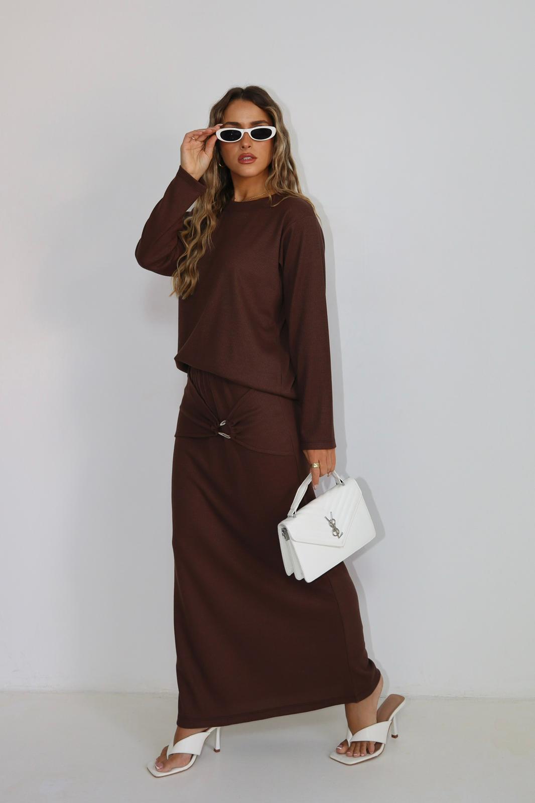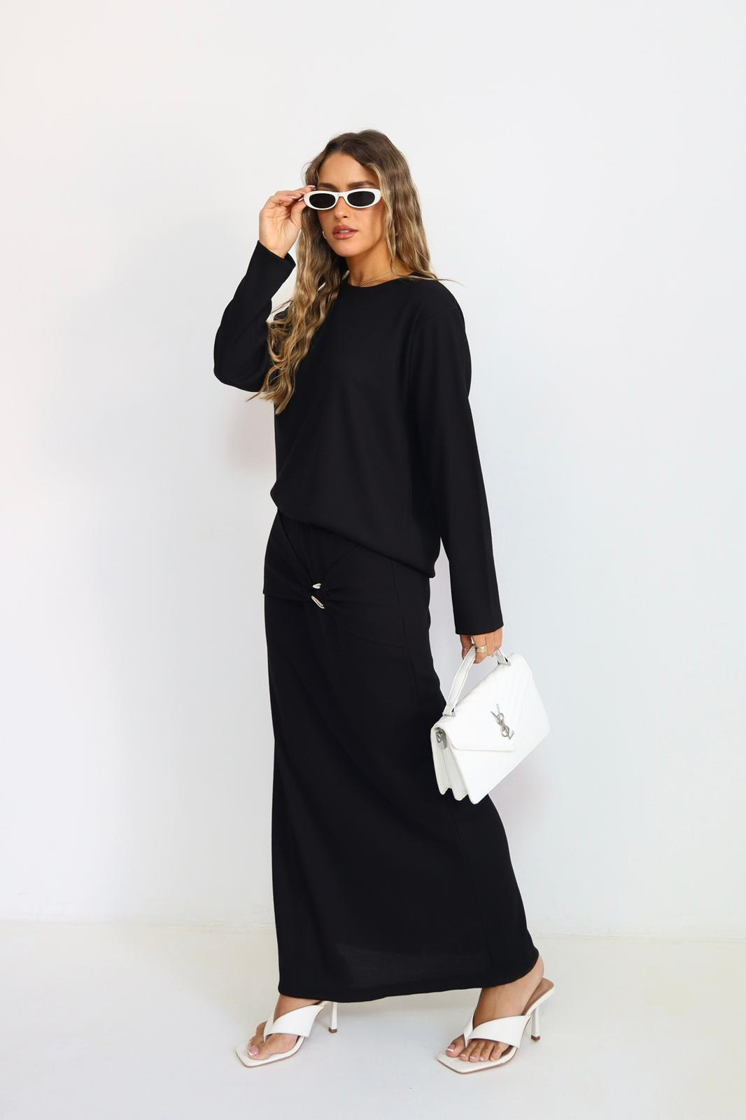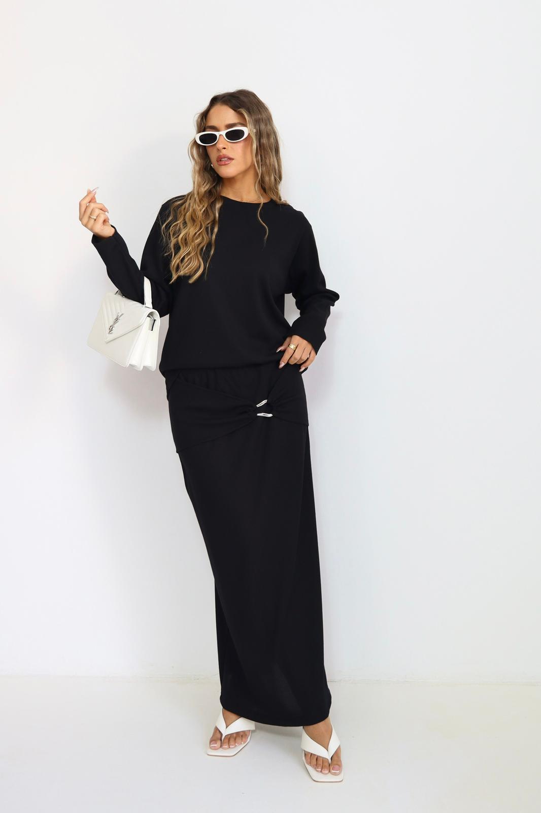 חולצה ארוכה בגזרה משוחררת עם חיבור מושלם לחצאית ארוכה בגזרת עיפרון, הכוללת קשירה עדינה בחלק הקדמי שמוסיפה טאץ’ ייחודי ואלגנטי.